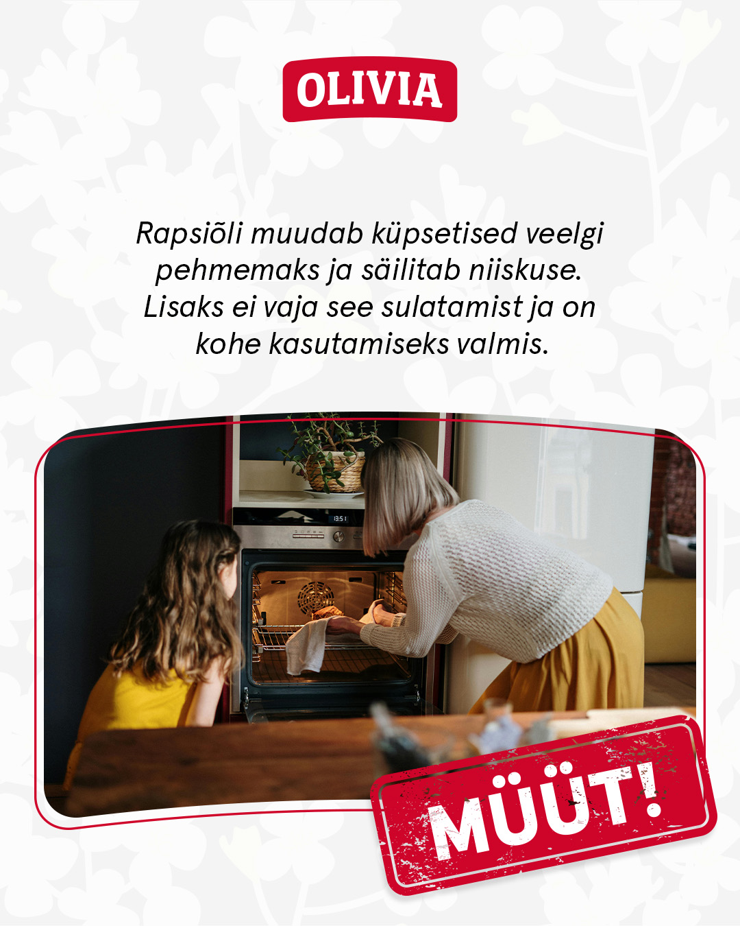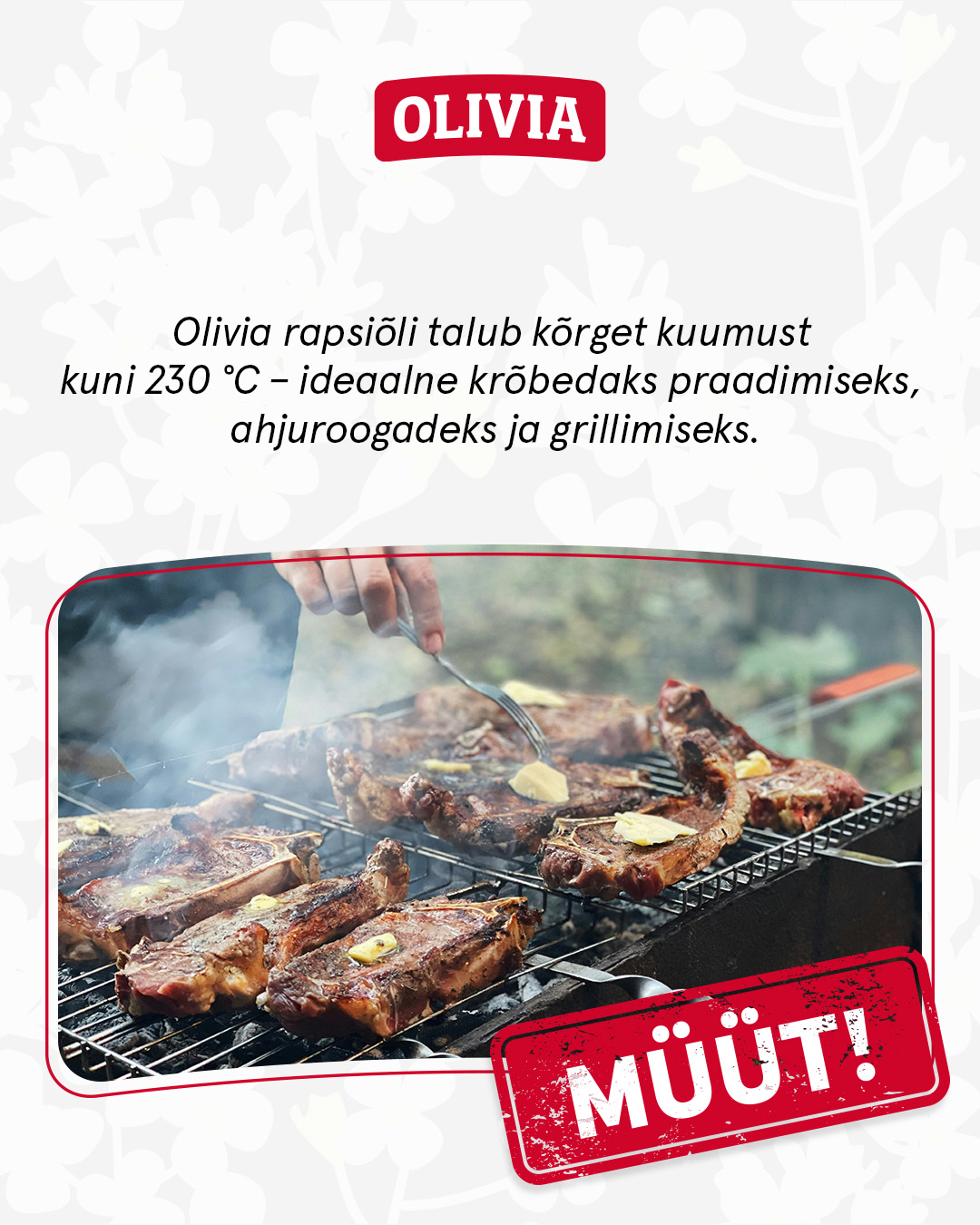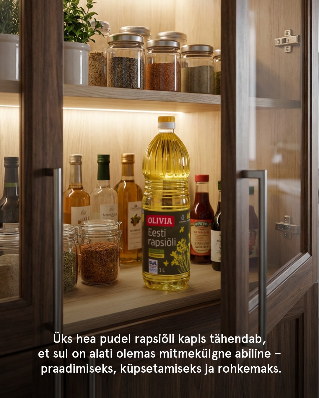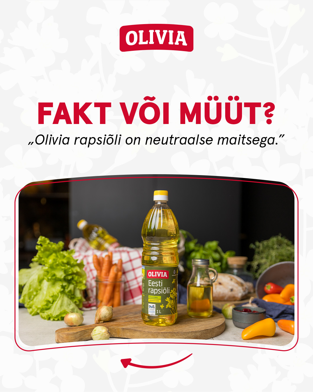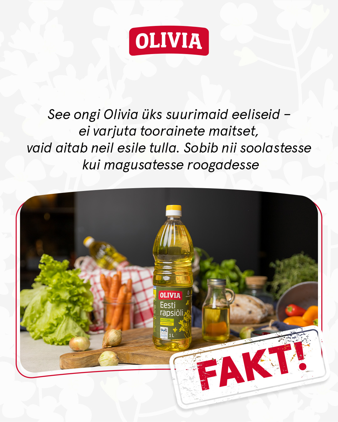 Suvel tee ääres näha olevad arvukad kollased rapsipõllud ei paku ainult ilusat vaadet ja kaunist maastikku, vaid sellest rapsist valmistatakse ka kodumaist Olivia rapsiõli. Kodumaine Olivia rapsiõli jõuab kiiresti ja värskena Sinu toidulauale. Olivia õli ei jäta toidule kõrvalmaitset, vaid toob välja roogade parimad omadused. Samuti on rapsiõli kasulik tervisele, kuna sisaldab asendamatuid oomega-3 ja oomega-6-rasvhappeid, mida organism ise ei tooda.